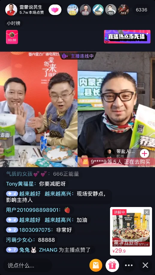下午(wu)15:00,內(nei)蒙(meng)古電視臺五大知名網紅(hong)主播(bo)(bo)(bo)(bo)雷(lei)(lei)蒙(meng)、孫曉雪(xue)、名研、郭大才、小(xiao)房子在(zai)抖音、快手兩(liang)大平臺的(de)5個(ge)直(zhi)播(bo)(bo)(bo)(bo)間同時啟動(dong),蒙(meng)清(qing)(qing)吃(chi)粗來每日粥(zhou)料和(he)(he)蕎麥面是雷(lei)(lei)蒙(meng)老(lao)(lao)師“雷(lei)(lei)蒙(meng)說民生”直(zhi)播(bo)(bo)(bo)(bo)間的(de)啟動(dong)產(chan)品(pin)(pin),雷(lei)(lei)蒙(meng)老(lao)(lao)師和(he)(he)清(qing)(qing)水(shui)(shui)河縣(xian)(xian)(xian)縣(xian)(xian)(xian)長(chang)亢(kang)永(yong)強(qiang)共同推薦帶貨;直(zhi)播(bo)(bo)(bo)(bo)一(yi)開始,網友們(men)反應熱烈,一(yi)邊刷屏“感謝雷(lei)(lei)蒙(meng)老(lao)(lao)師 推薦內(nei)蒙(meng)好(hao)(hao)產(chan)品(pin)(pin)”,“縣(xian)(xian)(xian)長(chang)好(hao)(hao)帥(shuai)”,一(yi)邊馬不停蹄趕去(qu)購物(wu)車下單; 亢(kang)永(yong)強(qiang)縣(xian)(xian)(xian)長(chang)重點介(jie)(jie)紹(shao)了(le)清(qing)(qing)水(shui)(shui)河作(zuo)為內(nei)蒙(meng)古優(you)質(zhi)(zhi)雜(za)糧產(chan)區的(de)產(chan)地優(you)勢和(he)(he)雜(za)糧的(de)綠色天(tian)然的(de)種植環(huan)境,以(yi)及蒙(meng)清(qing)(qing)農業作(zuo)為清(qing)(qing)水(shui)(shui)河當(dang)地的(de)龍(long)頭企業,通過收(shou)購貧(pin)(pin)困戶的(de)農產(chan)品(pin)(pin),幫助更多的(de)清(qing)(qing)水(shui)(shui)河縣(xian)(xian)(xian)貧(pin)(pin)苦戶脫貧(pin)(pin),呼吁(yu)大家購買扶(fu)貧(pin)(pin)產(chan)品(pin)(pin),為扶(fu)貧(pin)(pin)事(shi)業貢獻力(li)量;雷(lei)(lei)蒙(meng)老(lao)(lao)師重點從產(chan)品(pin)(pin)口(kou)感、品(pin)(pin)質(zhi)(zhi)、包裝細節和(he)(he)適(shi)宜人群(qun)角度做了(le)介(jie)(jie)紹(shao),為大家普(pu)及介(jie)(jie)紹(shao)了(le)雜(za)糧的(de)營(ying)養健康知識(shi),誠(cheng)意推薦好(hao)(hao)貨;