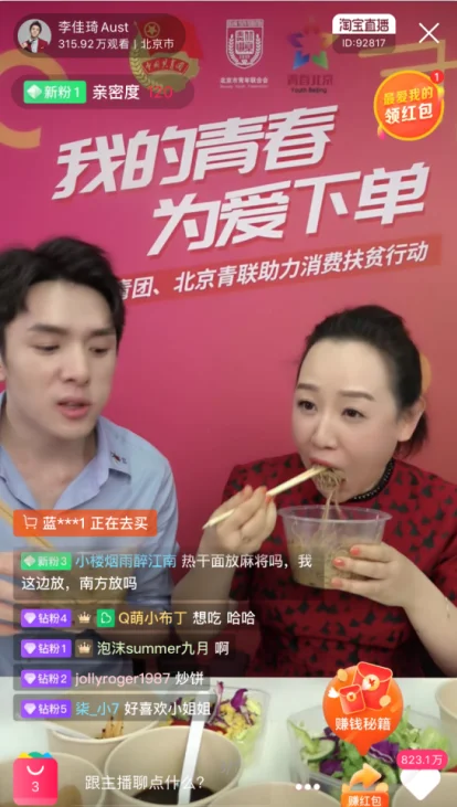 2020年5月9日晚,李(li)佳(jia)琦直播(bo)(bo)間(jian)帶貨(huo)蒙清(qing)吃(chi)粗(cu)來燕(yan)(yan)麥(mai)面(mian)(mian)、每日粥(zhou)料,直播(bo)(bo)間(jian)邀請了(le)作(zuo)(zuo)為(wei)北京(jing)青聯代表(biao)的(de)(de)(de)(de)“我(wo)愛(ai)我(wo)家”圓圓關(guan)凌(ling)作(zuo)(zuo)為(wei)嘉賓;開場李(li)佳(jia)琦就和關(guan)凌(ling)輕(qing)松的(de)(de)(de)(de)聊起了(le)作(zuo)(zuo)為(wei)“面(mian)(mian)條國度(du)”的(de)(de)(de)(de)中國,南(nan)方(fang)(fang)人(ren)(ren)(ren)和北方(fang)(fang)人(ren)(ren)(ren)都是(shi)怎么吃(chi)面(mian)(mian)的(de)(de)(de)(de);關(guan)凌(ling)幽默的(de)(de)(de)(de)回(hui)應(ying),作(zuo)(zuo)為(wei)吃(chi)貨(huo)的(de)(de)(de)(de)自(zi)己(ji)有發(fa)言權,北京(jing)人(ren)(ren)(ren)就愛(ai)吃(chi)炸醬面(mian)(mian);而作(zuo)(zuo)為(wei)湖(hu)南(nan)人(ren)(ren)(ren)的(de)(de)(de)(de)佳(jia)琦則表(biao)示,他的(de)(de)(de)(de)家鄉愛(ai)吃(chi)的(de)(de)(de)(de)是(shi)碼子面(mian)(mian),還有武漢的(de)(de)(de)(de)熱干面(mian)(mian)、西(xi)紅柿雞蛋面(mian)(mian);接下來工作(zuo)(zuo)人(ren)(ren)(ren)員擺上(shang)了(le)泡好的(de)(de)(de)(de)蒙清(qing)吃(chi)粗(cu)來燕(yan)(yan)麥(mai)面(mian)(mian)和切好的(de)(de)(de)(de)新鮮蔬菜、麻醬汁、老干媽辣(la)醬和醬油。佳(jia)琦調皮的(de)(de)(de)(de)表(biao)示,兩個人(ren)(ren)(ren)要(yao)互(hu)相給對方(fang)(fang)DIY面(mian)(mian)條,這(zhe)時可(ke)愛(ai)的(de)(de)(de)(de)關(guan)凌(ling)表(biao)現出了(le)她內心的(de)(de)(de)(de)溫暖細膩,馬上(shang)想到:佳(jia)琦是(shi)南(nan)方(fang)(fang)人(ren)(ren)(ren),而且(qie)(qie)每天工作(zuo)(zuo)壓力很(hen)大,需要(yao)多補充(chong)維生(sheng)素,于是(shi)給佳(jia)琦的(de)(de)(de)(de)面(mian)(mian)里加(jia)了(le)多多的(de)(de)(de)(de)蔬菜,還加(jia)了(le)湖(hu)南(nan)人(ren)(ren)(ren)愛(ai)吃(chi)的(de)(de)(de)(de)辣(la)醬;做(zuo)好面(mian)(mian)條,關(guan)凌(ling)不改(gai)吃(chi)貨(huo)本色,大口(kou)吃(chi)著,邊吃(chi)邊贊:燕(yan)(yan)麥(mai)面(mian)(mian)味道非常香(xiang),而且(qie)(qie)特(te)別的(de)(de)(de)(de)Q彈(dan)爽(shuang)滑(hua);佳(jia)琦也表(biao)示這(zhe)個面(mian)(mian)真的(de)(de)(de)(de)很(hen)好吃(chi),而且(qie)(qie)粗(cu)糧(liang)面(mian)(mian)非常健康,開水一泡就可(ke)以吃(chi),特(te)別的(de)(de)(de)(de)方(fang)(fang)便;這(zhe)時直播(bo)(bo)間(jian)產品上(shang)架(jia),3秒鐘即(ji)售罄;