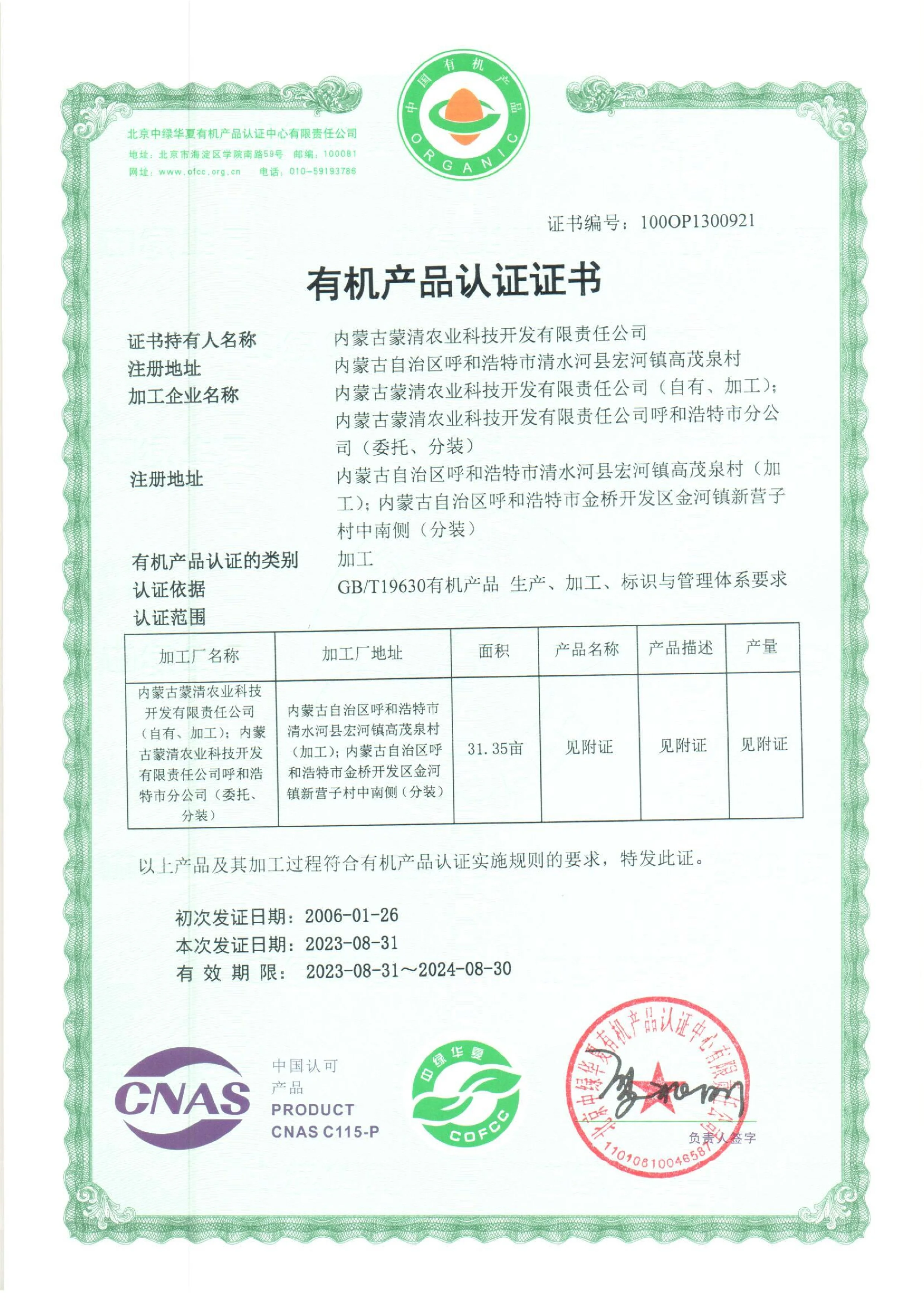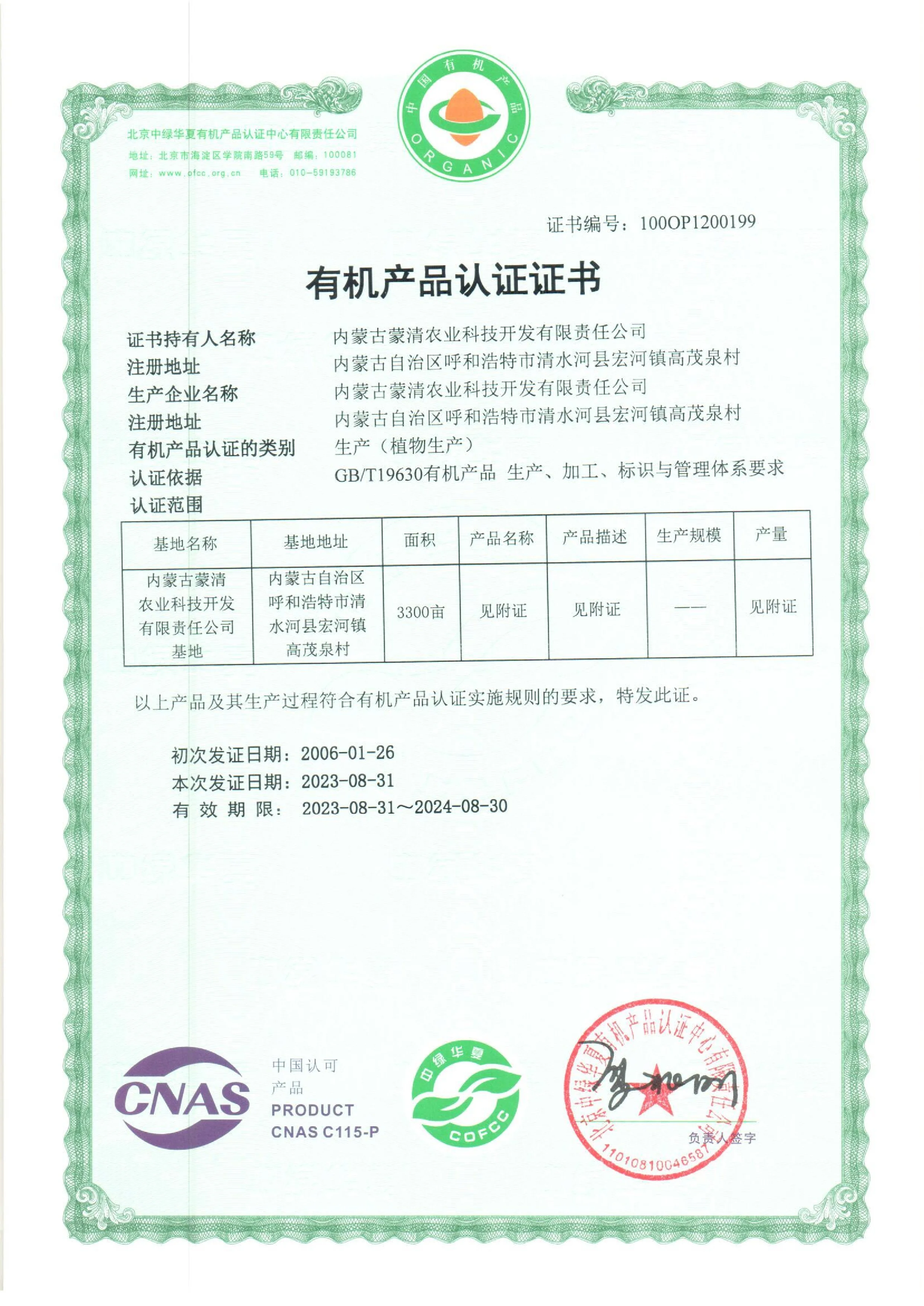 近日,蒙(meng)清(qing)(qing)農(nong)(nong)業(ye)產品(pin)順利通過(guo)有機(ji)(ji)認證,從2006年開始(shi),蒙(meng)清(qing)(qing)已連(lian)續第十(shi)八(ba)年獲得中國(guo)農(nong)(nong)業(ye)部中綠華夏有機(ji)(ji)認證,這是對蒙(meng)清(qing)(qing)農(nong)(nong)業(ye)在有機(ji)(ji)農(nong)(nong)業(ye)領域的(de)持續扎實努力的(de)證明。