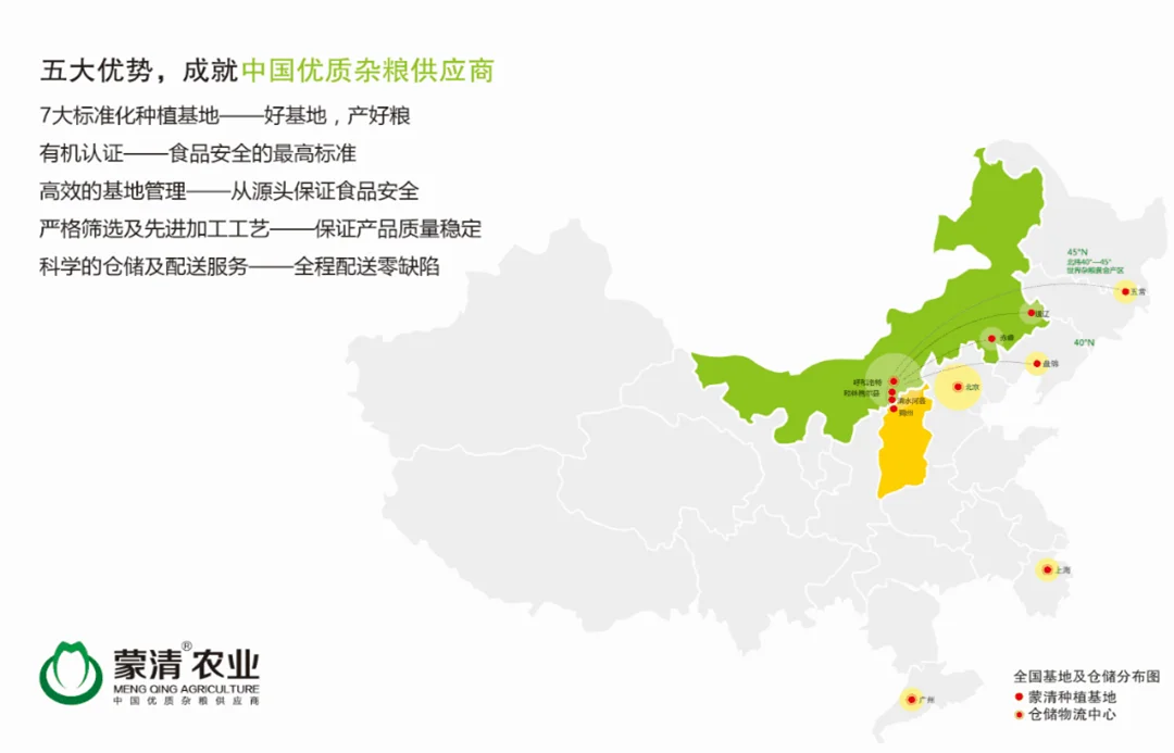 蒙清(qing)農業始建于1996年,現已(yi)形(xing)成包括雜(za)糧育種(zhong)、種(zhong)植、收儲、加工、銷售、雜(za)糧餐飲體(ti)驗、五谷雜(za)糧田園綜合體(ti)為(wei)一體(ti)的農(nong)業綜合企業。蒙(meng)清(qing)農(nong)業目前(qian)通過土地流轉、專業合作社及(ji)訂單農(nong)業實現規(gui)模化(hua)種(zhong)植5萬(wan)多畝,在(zai)清水河、和(he)(he)林(lin)、朔州(zhou)、赤峰、遼寧建平、黑龍江五常等地建立多種(zhong)作物的自由基合作種(zhong)植(zhi)基地,帶動和(he)(he)影響(xiang)農戶上萬(wan)戶。在(zai)線下,公司(si)以(yi)華北市(shi)場為(wei)主,產品已經覆蓋到全(quan)國各(ge)大(da)主要(yao)城市(shi),包括各(ge)大(da)型超市(shi)、批發(fa)市(shi)場,全(quan)國范圍的連(lian)鎖(suo)餐飲企(qi)業嘉和(he)(he)一品、馬家私房面(mian)等,大(da)中(zhong)專院校、幼兒園及各(ge)大(da)企(qi)業單位食堂供應等。在(zai)線上,公司(si)在(zai)天(tian)貓、京(jing)東(dong)平臺開設了旗艦店(dian),同時(shi)在(zai)京(jing)東(dong)平臺入駐(zhu)了京(jing)東(dong)超市(shi),成為(wei)京(jing)東(dong)十大(da)糧(liang)油供應商之一;此外,在(zai)今合網、善融(rong)、融(rong)E購平臺,通過創新(xin)的產品(pin)和主題活動,贏(ying)得(de)(de)了(le)眾多消費者(zhe)的認可,并取得(de)(de)了(le)非常好的銷售成績。