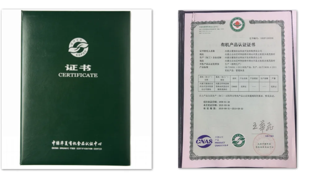 2018年7月7-8日,內蒙古蒙清農業科技開發有限責任公司順利通過了農業部中綠華夏有機食品認證中心檢查組為期2天的有機種植、有機加工現場審核,并于2018年9月6日獲頒有機產品認證證書,有效期為2018年8月31日—2019年8月30日。