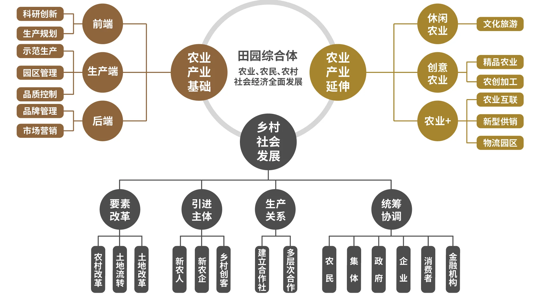 田園綜(zong)合體(ti)的(de)(de)目標,是(shi)實現地方(fang)社會經濟全(quan)面發展(zhan)。在(zai)上述模型(xing)中,我們可以看出,這個終(zhong)局的(de)(de)形(xing)成(cheng),是(shi)多(duo)方(fang)參與、過程發展(zhan)的(de)(de)結(jie)(jie)果,并(bing)不是(shi)單(dan)靠政(zheng)府(fu)、單(dan)靠農民能夠(gou)(gou)完(wan)(wan)成(cheng),也不是(shi)絕對地說由(you)誰牽頭就能夠(gou)(gou)完(wan)(wan)成(cheng),更(geng)不是(shi)通過招商由(you)某(mou)個企業(ye)來主(zhu)(zhu)導完(wan)(wan)成(cheng)的(de)(de)。而是(shi)要(yao)(yao)形(xing)成(cheng)共識,構(gou)建一個多(duo)方(fang)利益共享(xiang)共生的(de)(de)畫(hua)卷(juan)。政(zheng)府(fu)對需要(yao)(yao)補貼(tie)支持的(de)(de)部分作補貼(tie)支持,對需要(yao)(yao)改革和(he)重新規劃的(de)(de)給予產(chan)業(ye)政(zheng)策引導,然后(hou)由(you)各(ge)方(fang)主(zhu)(zhu)體(ti)發揮(hui)所長積極參與創造(zao),形(xing)成(cheng)我們也可稱之(zhi)為田園綜(zong)合體(ti)的(de)(de)“新結(jie)(jie)構(gou)”。這個新結(jie)(jie)構(gou)是(shi)戰(zhan)略,隨后(hou)還要(yao)(yao)有(you)空氣土(tu)壤讓這個戰(zhan)略落地,還要(yao)(yao)有(you)“想干、敢干、能干”的(de)(de)各(ge)方(fang)主(zhu)(zhu)體(ti)拼(pin)力(li)執行,相互(hu)協力(li)支持,最(zui)后(hou)方(fang)得(de)成(cheng)功(gong)!